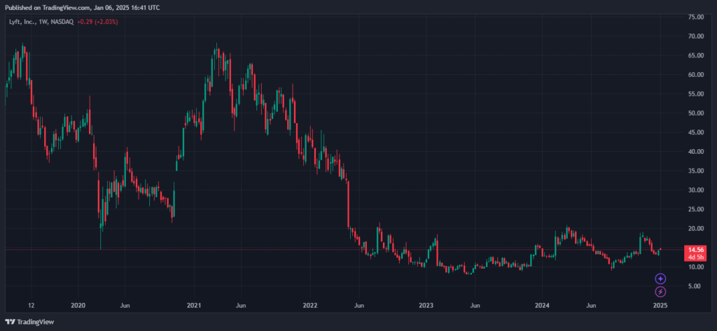 - 2023: A Lyft mostrou sinais de recuperação, fechando o ano em torno de $15, impulsionada por medidas de corte de custos e parcerias estratégicas.