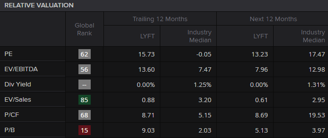 - EV/Vendas (Valor da Empresa/Vendas): Nos últimos 12 meses, o rácio EV/Vendas da Lyft foi de 0.88, bem abaixo da mediana da indústria de 3.20. Para os próximos 12 meses, o rácio EV/Vendas da Lyft é projetado ser de 0.61, comparado com a mediana da indústria de 2.95.