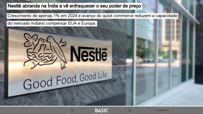 - A Índia representa hoje uma contribuição limitada para o topo do grupo, com cerca de 2% do “top line” da Nestlé, reduzindo a capacidade do país de compensar a fraqueza em Europa e EUA.