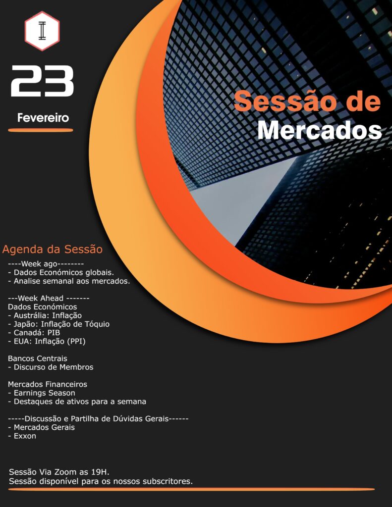 Sessão de Mercados de 23 Fev 26, das 19H – 20H. Venha descobrir os eventos de economia e mercados para a semana, assim como conhecer o tema da semana escolhido pelos nossos utilizadores. Aqui partilhamos a nossa visão e discutimos opiniões.